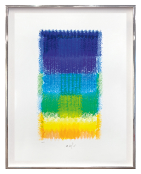 1957 gemeinsame Gründung mit Otto Piene der Gruppe ZERO in Düsseldorf. Ein Jahr später nimmt Mack an der Documenta II in Kassel teil und erhält den Kunstpreis der Stadt Krefeld.Mack erhält den Premio Marzotto.